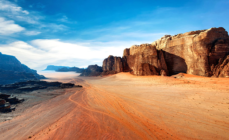 - 요르단의 붉은 사막 속 거대한 바위산들이 조각품처럼 장관을 이루고 있으며 자연 문화유산으로 지정되었고 바위에는 선사시대 유목민들의 암벽화도 볼 수 있어 자연뿐만 아니라 고고학적 연구 가치도 높은 지역 등