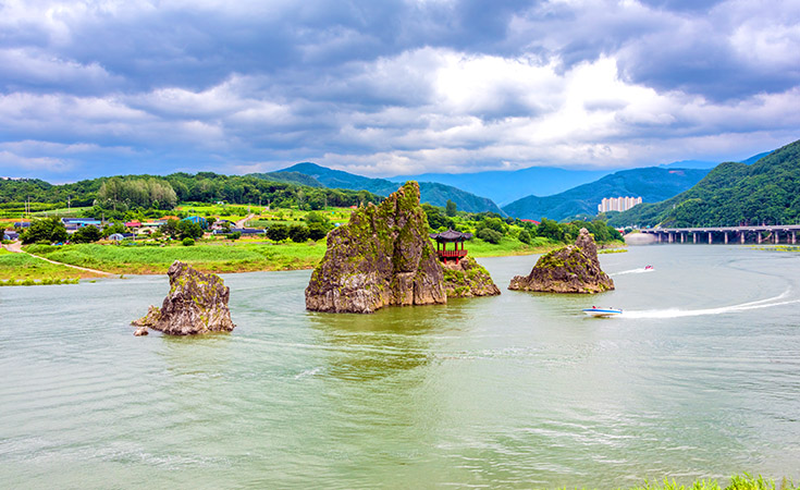 - 도담삼봉 : 남한강 상류에 3개의 기암괴석이 절경을 이룬 곳으로 조선 왕조의 개국공신인 정도전이 정자를 짓고 풍월을 읊었다하여 정도전의 호인 [삼봉]을 따서 이름지어진 멋스러운 장소