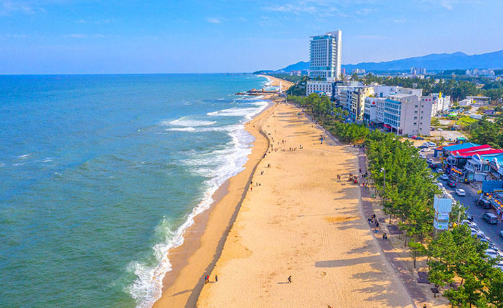 - 경포해수욕장(자유산책) : 동해 바다 최고의 해안선을 지닌 곳으로 향긋한 내음이 강한 소나무 숲길을 거닐며 힐링해 보세요!
