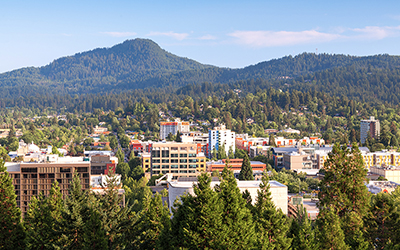 - 오레건주 제2의 도시로 울창한 살림 비옥한 토지로 농산물과 목재 생산을 하고, 멕켄지 강 주변의 풍경이 아름다워 많은 관광객이 찾는 곳이다. 현지 수제맥주의 맛과 경이로운 자연을 함께 즐길 수 있다.