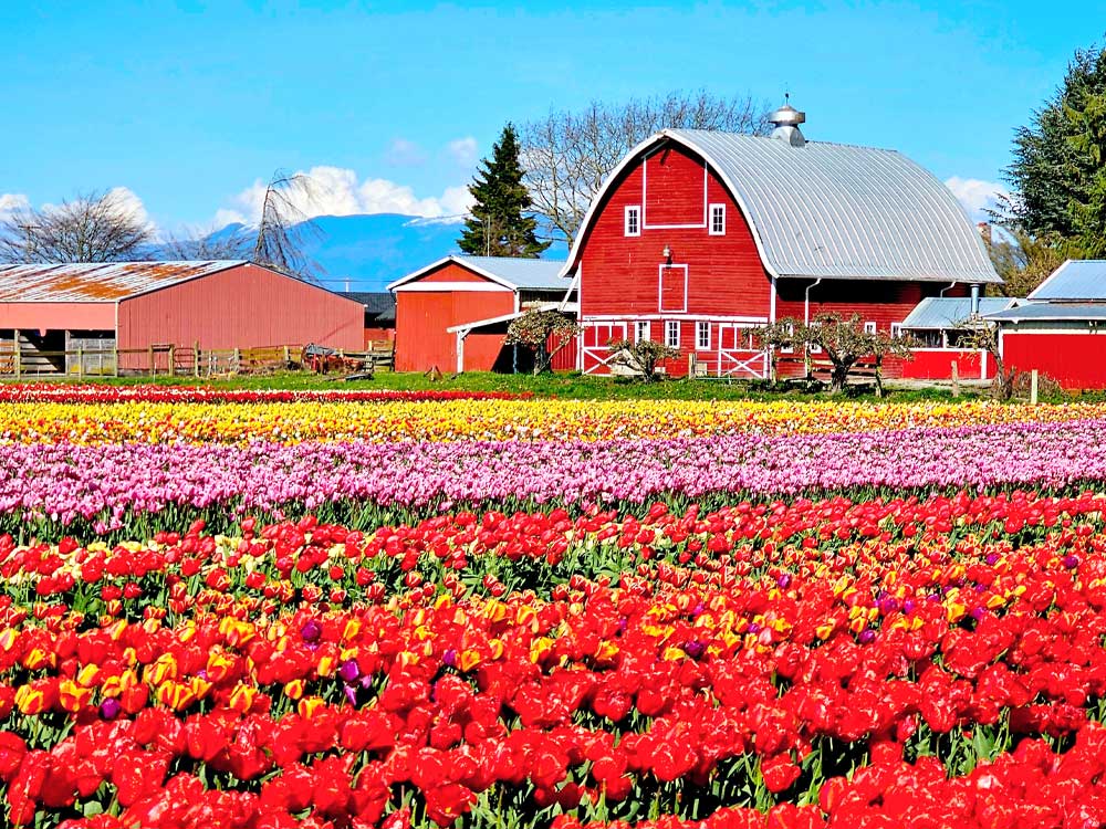 ① 루젠가르데 튤립 축제 - 그림처럼 끝없이 펼쳐진 형형색색의 튤립 밭을 배경으로 하는 워싱턴주 대표 명소