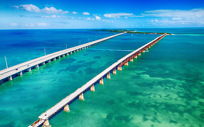 - 42개의 섬을 43개의 다리로 연결된 하늘과 바다가 맞 닿은듯한 경관을 내뿜는 7마일 길이의 다리입니다. 미국에서 가장 아름다운 고속도로중 하나라고 평가받고 있으며 좌측은 대서양, 우측은 멕시코만을 가르며 키웨스트로 향합니다. 섬에서 섬으로 끝없이 펼쳐진 산호초의 바다위에 다리를 걸쳐진 이 도로는 마치 바다위를 달리며 하늘을 나는 듯한 기분을 만끽할수 있을것입니다.